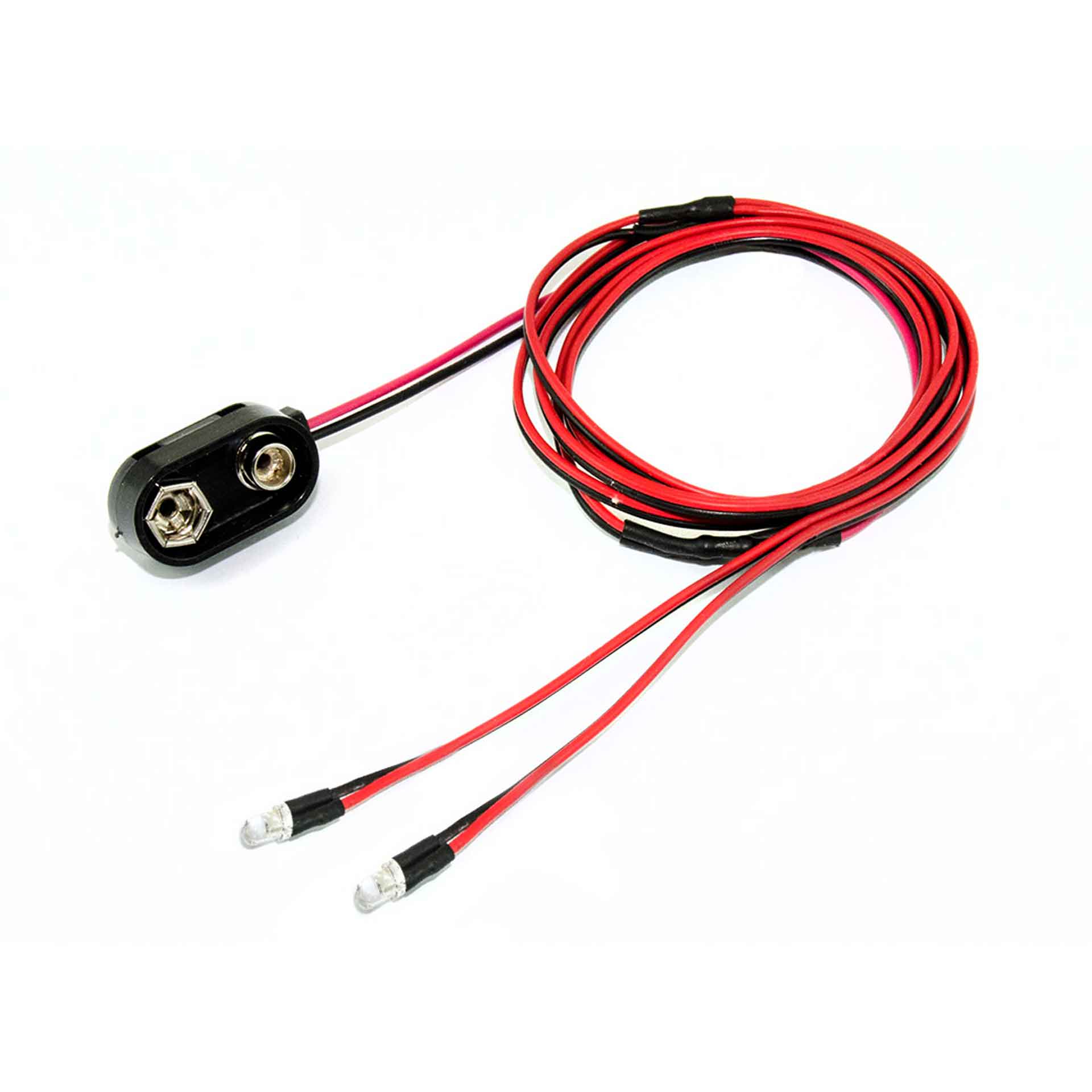 Diese einbaufertige Beleuchtung besteht aus 2 kaltweißen 3mm LED mit 80cm Anschlusskabel und einem hochwertigen 9V Clip. Es sind keine Lötarbeiten mehr nötig. Die dünnen Litzenkabel sind bereits mit den LEDs verlötet und mit Qualitätsschrumpfschlauch isoliert. Der Kabelabstand zwischen den LEDs beträgt 30 cm. Die Gesamtlänge bis zu einer LED beträgt 95 cm.